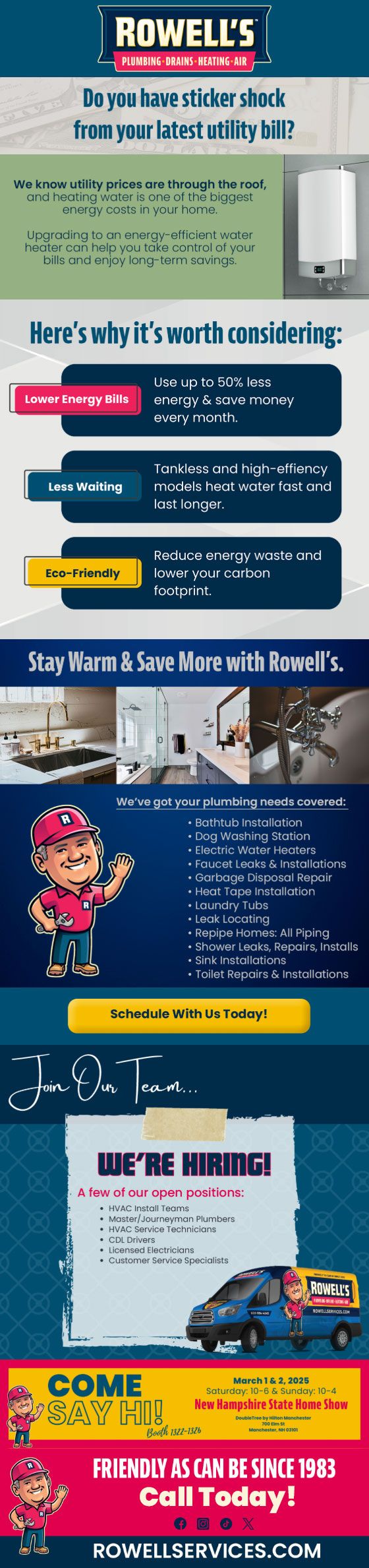 "Friendly As Can Be Since 1983!" When you need help with your plumbing, drains, heating, cooling or electrical in Danbury, you can always rely on Rowell's Services! Call us now or book online!